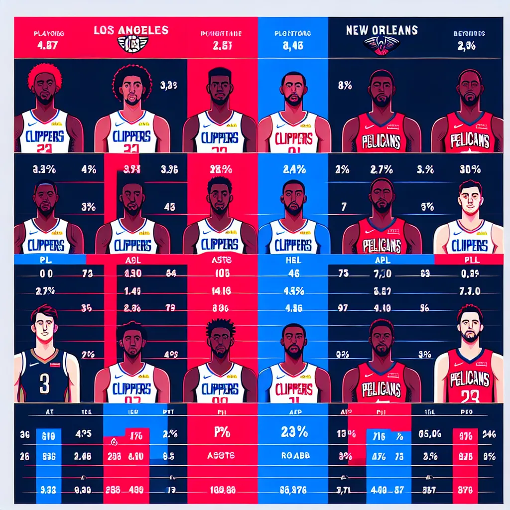 Лос-Анджелес Клипперс и Нью-Орлеан Пеликанс имеют свои сильные и слабые стороны, отраженные в статистике их игроков. Клипперс часто выделяются сильной защитой и опытом ключевых игроков, таких как Кавай Леонард и Пол Джордж, которые могут влиять на игру как в атаке, так и в защите. Пеликанс, с другой стороны, известны своей молодой и динамичной командой, в которой выделяются игроки, такие как Зайон Уильямсон и Брэндон Ингрэм, способные набирать очки и создавать моменты. В целом, Клипперс могут иметь преимущество в опыте и защите, тогда как Пеликанс могут превосходить в скорости и атлетизме.